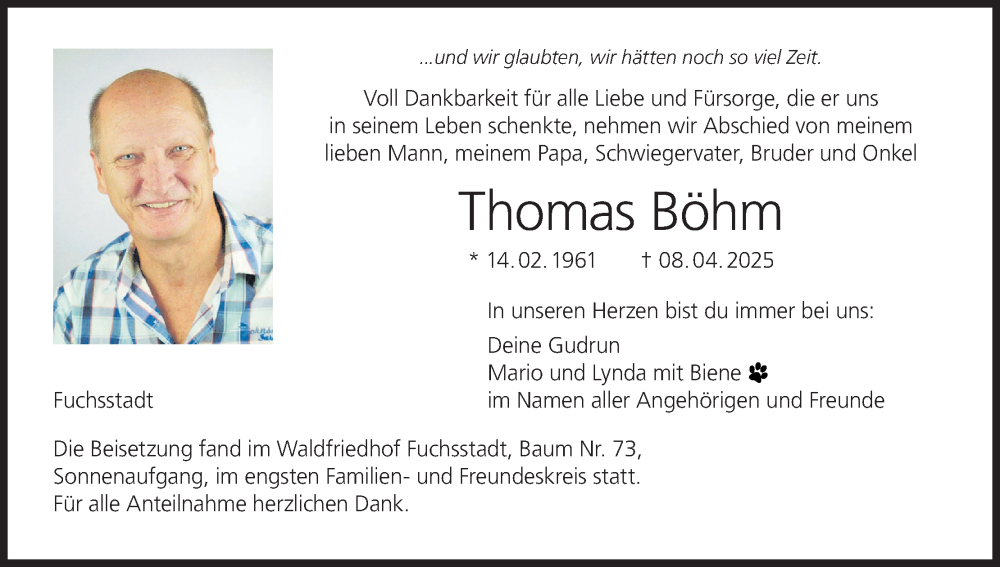 Hier finden Sie alle Traueranzeigen aus der Zeitung, die bisher für Thomas Böhm erschienen sind. Weitere Traueranzeigen, die in der Zeitung erscheinen, werden hier ebenfalls aufgelistet