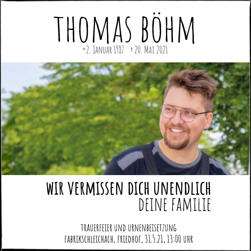 Hier finden Sie alle Traueranzeigen aus der Zeitung, die bisher für Thomas Böhm erschienen sind. Weitere Traueranzeigen, die in der Zeitung erscheinen, werden hier ebenfalls aufgelistet