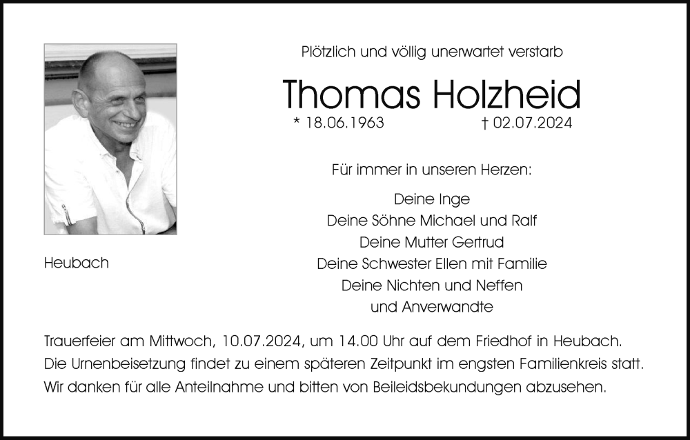 Hier finden Sie alle Traueranzeigen aus der Zeitung, die bisher für Thomas Holzheld erschienen sind. Weitere Traueranzeigen, die in der Zeitung erscheinen, werden hier ebenfalls aufgelistet