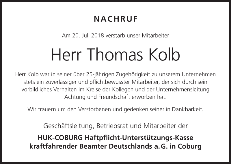 Hier finden Sie alle Traueranzeigen aus der Zeitung, die bisher für Thomas Kolb erschienen sind. Weitere Traueranzeigen, die in der Zeitung erscheinen, werden hier ebenfalls aufgelistet