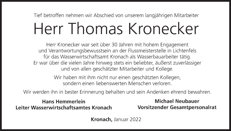 Hier finden Sie alle Traueranzeigen aus der Zeitung, die bisher für Thomas Kronecker erschienen sind. Weitere Traueranzeigen, die in der Zeitung erscheinen, werden hier ebenfalls aufgelistet