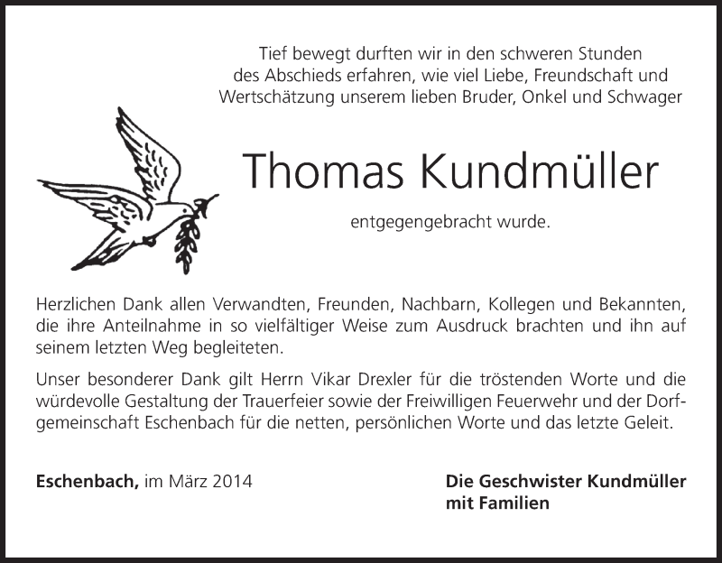 Hier finden Sie alle Traueranzeigen aus der Zeitung, die bisher für Thomas Kundmüller erschienen sind. Weitere Traueranzeigen, die in der Zeitung erscheinen, werden hier ebenfalls aufgelistet