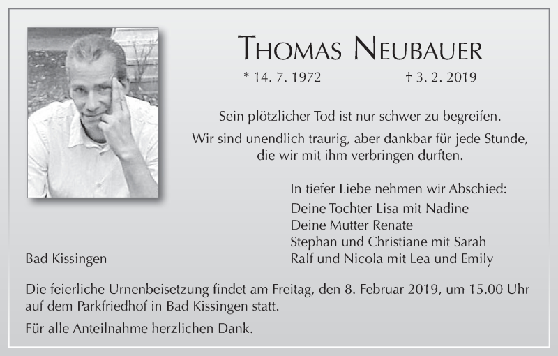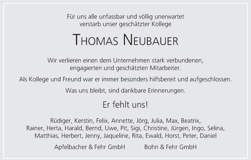 Hier finden Sie alle Traueranzeigen aus der Zeitung, die bisher für Thomas Neubauer erschienen sind. Weitere Traueranzeigen, die in der Zeitung erscheinen, werden hier ebenfalls aufgelistet