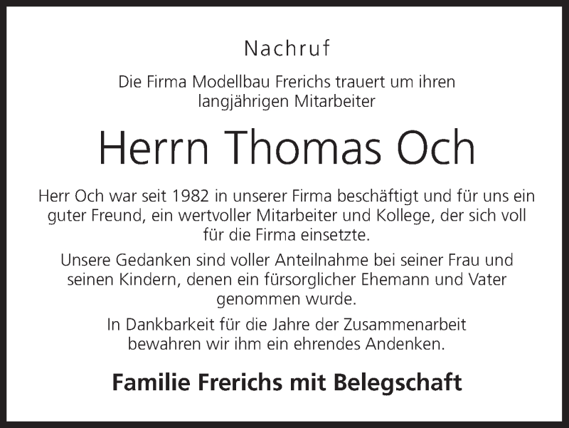 Hier finden Sie alle Traueranzeigen aus der Zeitung, die bisher für Thomas Och erschienen sind. Weitere Traueranzeigen, die in der Zeitung erscheinen, werden hier ebenfalls aufgelistet