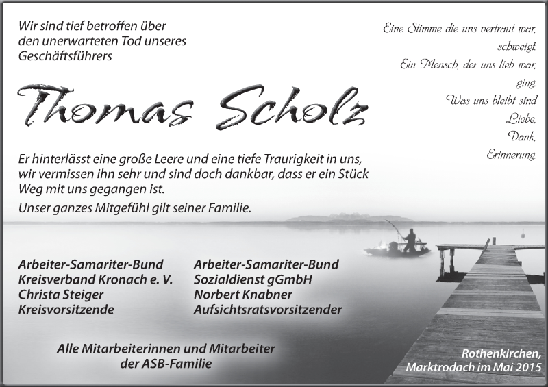 Hier finden Sie alle Traueranzeigen aus der Zeitung, die bisher für Thomas Scholz erschienen sind. Weitere Traueranzeigen, die in der Zeitung erscheinen, werden hier ebenfalls aufgelistet