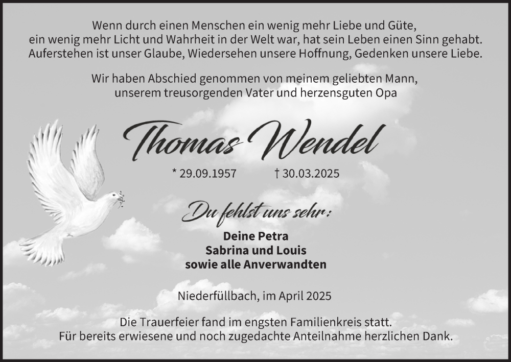 Hier finden Sie alle Traueranzeigen aus der Zeitung, die bisher für Thomas Wendel erschienen sind. Weitere Traueranzeigen, die in der Zeitung erscheinen, werden hier ebenfalls aufgelistet