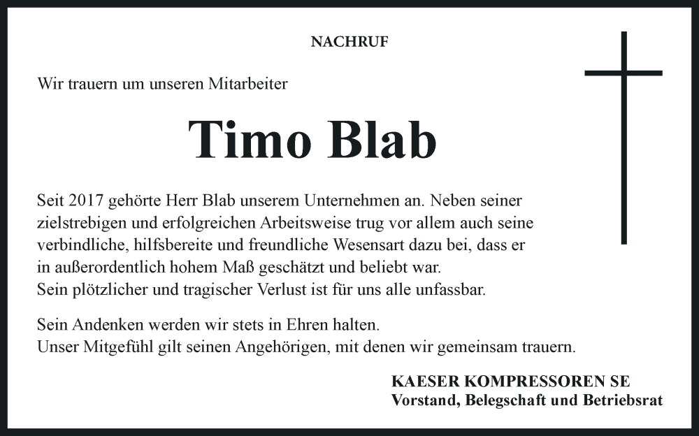 Hier finden Sie alle Traueranzeigen aus der Zeitung, die bisher für Timo Blab erschienen sind. Weitere Traueranzeigen, die in der Zeitung erscheinen, werden hier ebenfalls aufgelistet