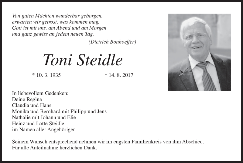 Hier finden Sie alle Traueranzeigen aus der Zeitung, die bisher für Toni Steidle erschienen sind. Weitere Traueranzeigen, die in der Zeitung erscheinen, werden hier ebenfalls aufgelistet