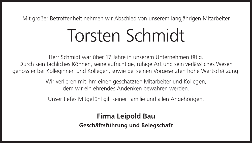 Hier finden Sie alle Traueranzeigen aus der Zeitung, die bisher für Torsten Schmidt erschienen sind. Weitere Traueranzeigen, die in der Zeitung erscheinen, werden hier ebenfalls aufgelistet