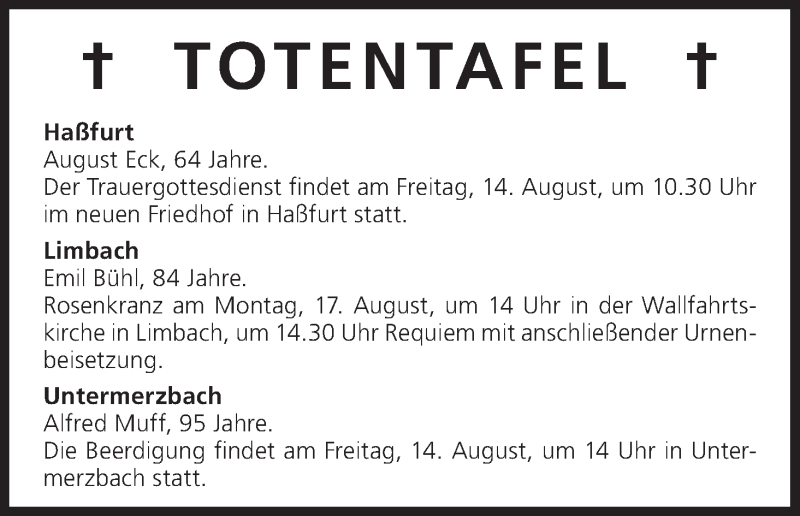 Hier finden Sie alle Traueranzeigen aus der Zeitung, die bisher für Totentafel, vom 14.08.2015 erschienen sind. Weitere Traueranzeigen, die in der Zeitung erscheinen, werden hier ebenfalls aufgelistet