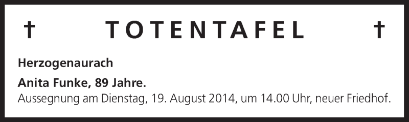 Hier finden Sie alle Traueranzeigen aus der Zeitung, die bisher für Totentafel, vom 15.08.2014 erschienen sind. Weitere Traueranzeigen, die in der Zeitung erscheinen, werden hier ebenfalls aufgelistet