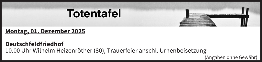 Hier finden Sie alle Traueranzeigen aus der Zeitung, die bisher für Totentafel vom 01.12.2025 erschienen sind. Weitere Traueranzeigen, die in der Zeitung erscheinen, werden hier ebenfalls aufgelistet