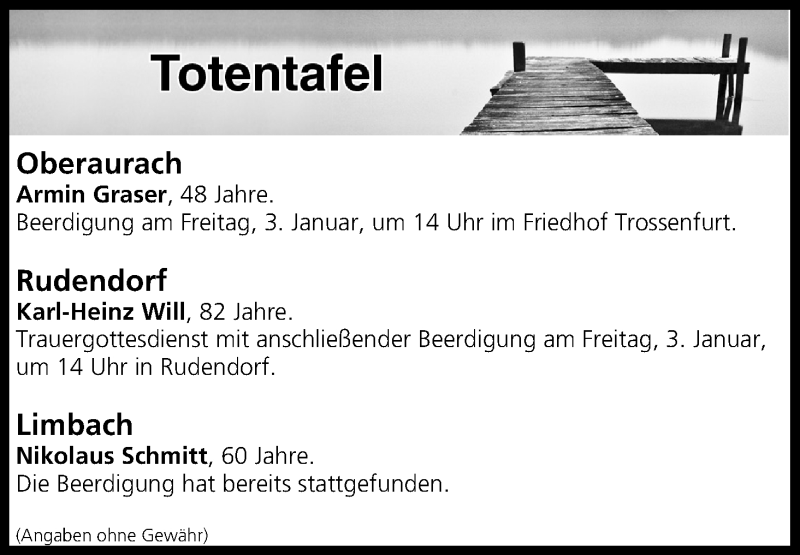 Hier finden Sie alle Traueranzeigen aus der Zeitung, die bisher für Totentafel vom 03.01.2020 erschienen sind. Weitere Traueranzeigen, die in der Zeitung erscheinen, werden hier ebenfalls aufgelistet