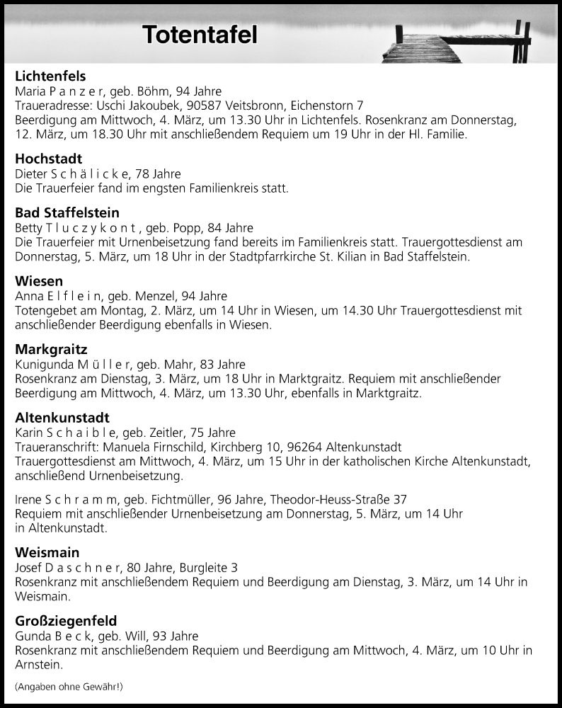 Hier finden Sie alle Traueranzeigen aus der Zeitung, die bisher für Totentafel vom 03.03.2020 erschienen sind. Weitere Traueranzeigen, die in der Zeitung erscheinen, werden hier ebenfalls aufgelistet