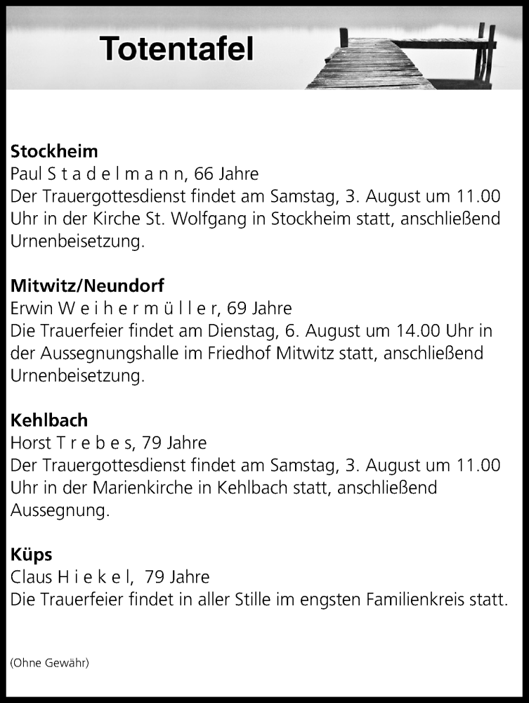 Hier finden Sie alle Traueranzeigen aus der Zeitung, die bisher für Totentafel vom 03.08.2019 erschienen sind. Weitere Traueranzeigen, die in der Zeitung erscheinen, werden hier ebenfalls aufgelistet