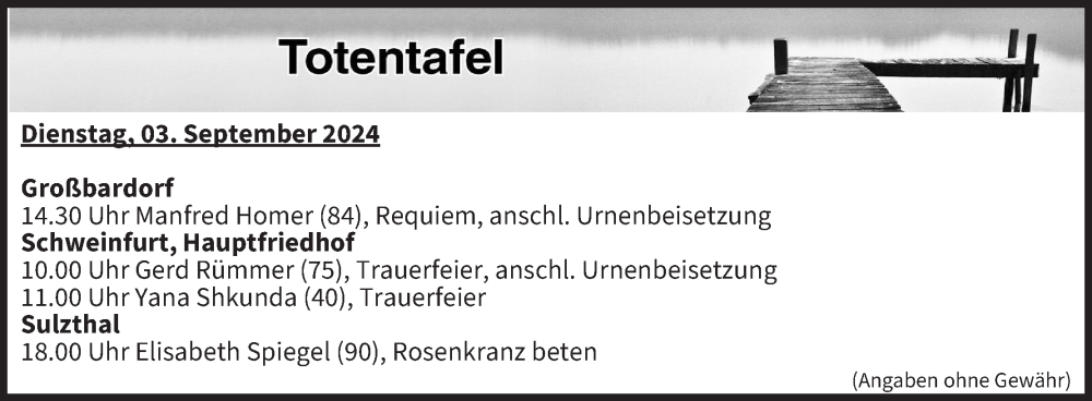 Hier finden Sie alle Traueranzeigen aus der Zeitung, die bisher für Totentafel vom 03.09.2024 erschienen sind. Weitere Traueranzeigen, die in der Zeitung erscheinen, werden hier ebenfalls aufgelistet