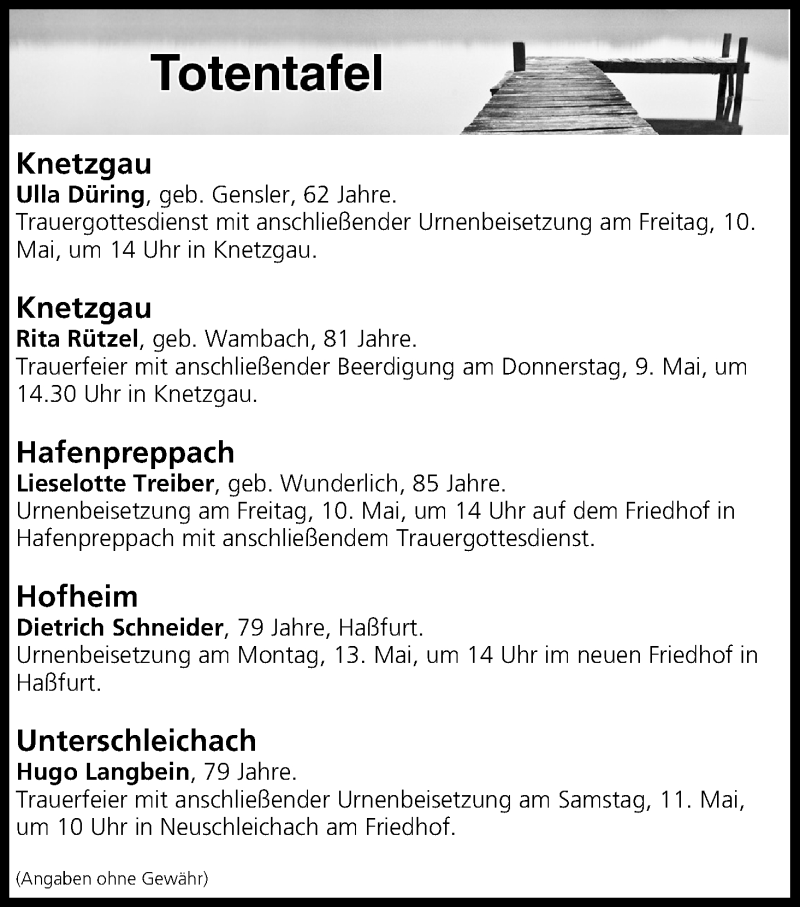Hier finden Sie alle Traueranzeigen aus der Zeitung, die bisher für Totentafel vom 09.05.2019 erschienen sind. Weitere Traueranzeigen, die in der Zeitung erscheinen, werden hier ebenfalls aufgelistet