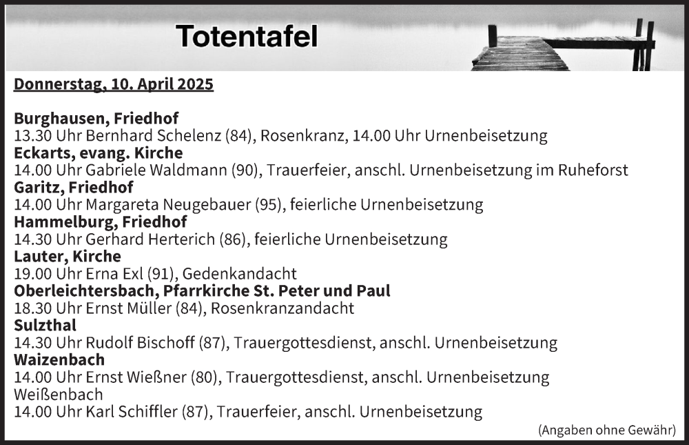 Hier finden Sie alle Traueranzeigen aus der Zeitung, die bisher für Totentafel vom 10.04.2025 erschienen sind. Weitere Traueranzeigen, die in der Zeitung erscheinen, werden hier ebenfalls aufgelistet