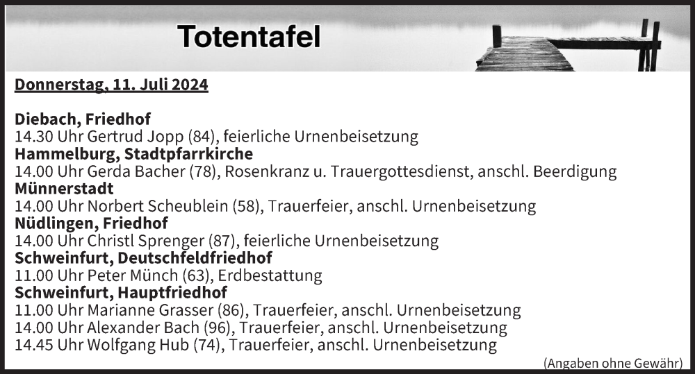 Hier finden Sie alle Traueranzeigen aus der Zeitung, die bisher für Totentafel vom 11.07.2024 erschienen sind. Weitere Traueranzeigen, die in der Zeitung erscheinen, werden hier ebenfalls aufgelistet