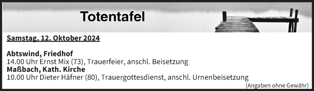 Hier finden Sie alle Traueranzeigen aus der Zeitung, die bisher für Totentafel vom 12.10.2024 erschienen sind. Weitere Traueranzeigen, die in der Zeitung erscheinen, werden hier ebenfalls aufgelistet