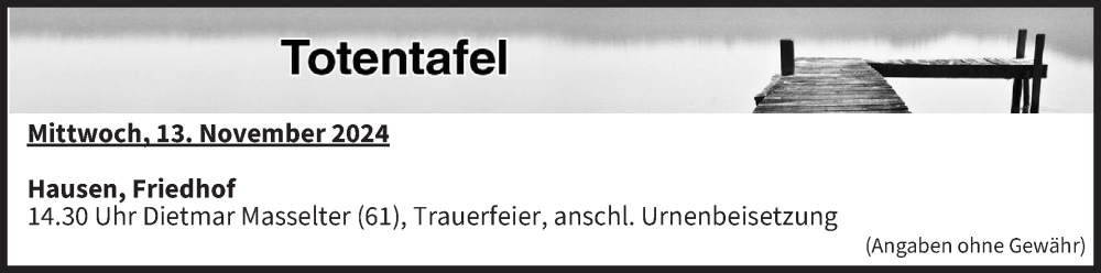 Hier finden Sie alle Traueranzeigen aus der Zeitung, die bisher für Totentafel vom 13.11.2024 erschienen sind. Weitere Traueranzeigen, die in der Zeitung erscheinen, werden hier ebenfalls aufgelistet