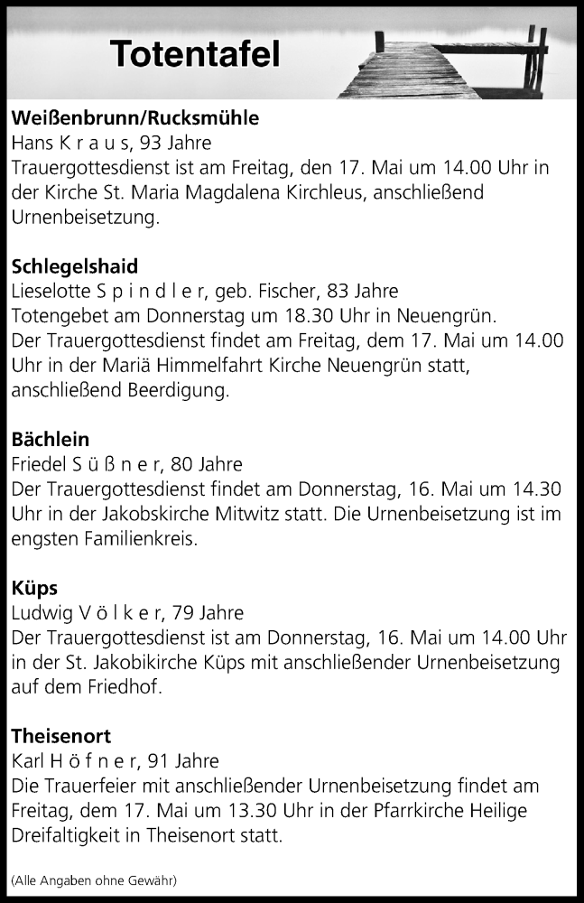 Hier finden Sie alle Traueranzeigen aus der Zeitung, die bisher für Totentafel vom 16.05.2019 erschienen sind. Weitere Traueranzeigen, die in der Zeitung erscheinen, werden hier ebenfalls aufgelistet