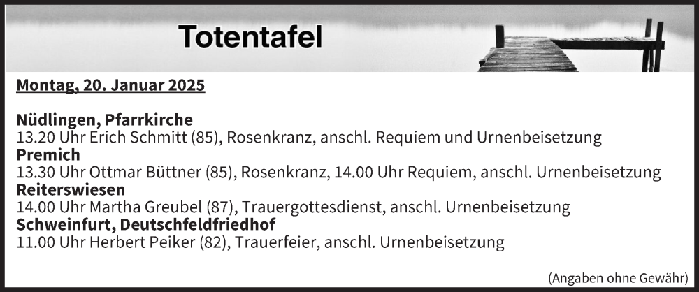 Hier finden Sie alle Traueranzeigen aus der Zeitung, die bisher für Totentafel vom 20.01.2025 erschienen sind. Weitere Traueranzeigen, die in der Zeitung erscheinen, werden hier ebenfalls aufgelistet