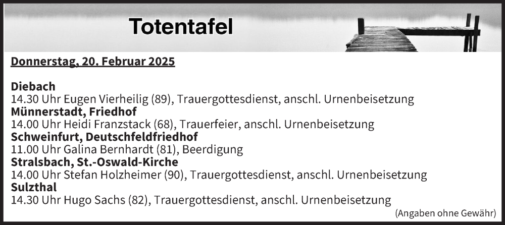 Hier finden Sie alle Traueranzeigen aus der Zeitung, die bisher für Totentafel vom 20.02.2025 erschienen sind. Weitere Traueranzeigen, die in der Zeitung erscheinen, werden hier ebenfalls aufgelistet