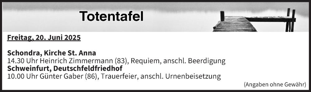 Hier finden Sie alle Traueranzeigen aus der Zeitung, die bisher für Totentafel vom 20.06.2025 erschienen sind. Weitere Traueranzeigen, die in der Zeitung erscheinen, werden hier ebenfalls aufgelistet