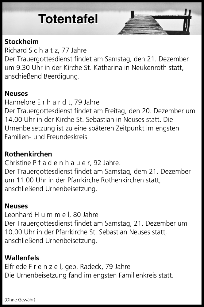 Hier finden Sie alle Traueranzeigen aus der Zeitung, die bisher für Totentafel vom 20.12.2019 erschienen sind. Weitere Traueranzeigen, die in der Zeitung erscheinen, werden hier ebenfalls aufgelistet