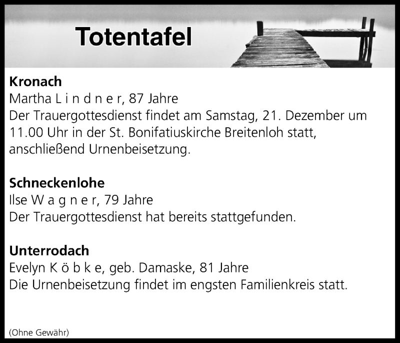 Hier finden Sie alle Traueranzeigen aus der Zeitung, die bisher für Totentafel vom 21.12.2019 erschienen sind. Weitere Traueranzeigen, die in der Zeitung erscheinen, werden hier ebenfalls aufgelistet