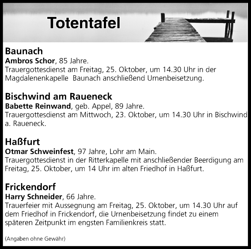 Hier finden Sie alle Traueranzeigen aus der Zeitung, die bisher für Totentafel vom 23.10.2019 erschienen sind. Weitere Traueranzeigen, die in der Zeitung erscheinen, werden hier ebenfalls aufgelistet