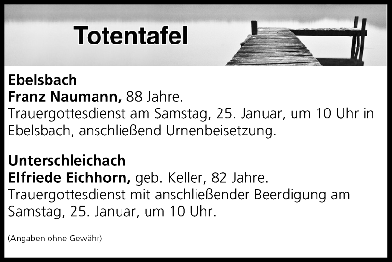 Hier finden Sie alle Traueranzeigen aus der Zeitung, die bisher für Totentafel vom 24.01.2020 erschienen sind. Weitere Traueranzeigen, die in der Zeitung erscheinen, werden hier ebenfalls aufgelistet
