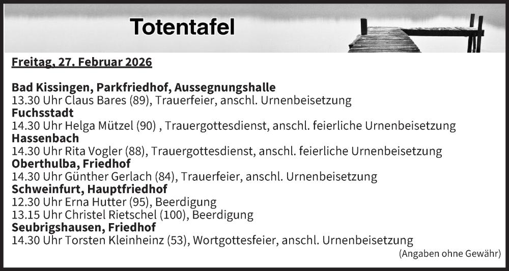 Hier finden Sie alle Traueranzeigen aus der Zeitung, die bisher für Totentafel vom 27.02.2026 erschienen sind. Weitere Traueranzeigen, die in der Zeitung erscheinen, werden hier ebenfalls aufgelistet