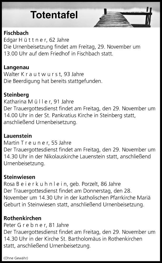 Hier finden Sie alle Traueranzeigen aus der Zeitung, die bisher für Totentafel vom 28.11.2019 erschienen sind. Weitere Traueranzeigen, die in der Zeitung erscheinen, werden hier ebenfalls aufgelistet
