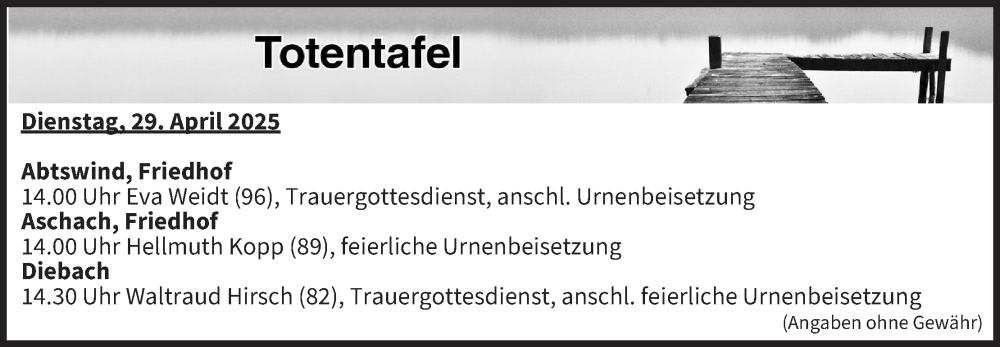 Hier finden Sie alle Traueranzeigen aus der Zeitung, die bisher für Totentafel vom 29.04.2025 erschienen sind. Weitere Traueranzeigen, die in der Zeitung erscheinen, werden hier ebenfalls aufgelistet