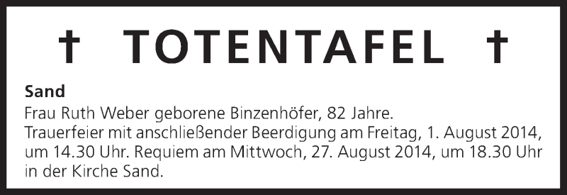 Hier finden Sie alle Traueranzeigen aus der Zeitung, die bisher für Totentafel vom 01.08.2014 erschienen sind. Weitere Traueranzeigen, die in der Zeitung erscheinen, werden hier ebenfalls aufgelistet