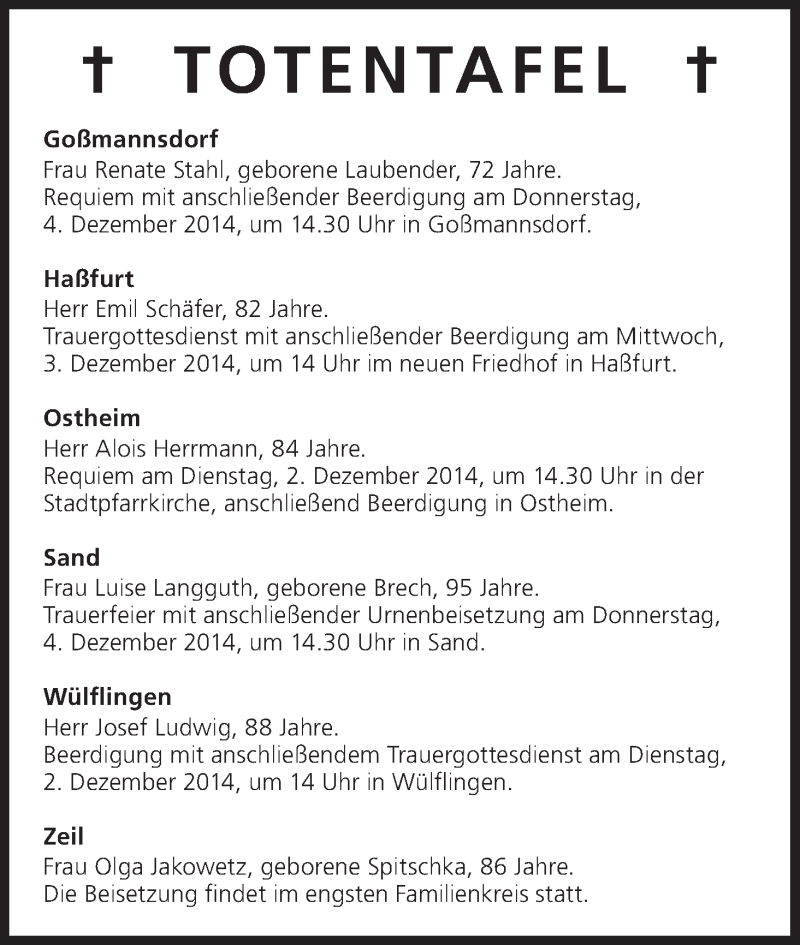 Hier finden Sie alle Traueranzeigen aus der Zeitung, die bisher für Totentafel vom 02.12.2014 erschienen sind. Weitere Traueranzeigen, die in der Zeitung erscheinen, werden hier ebenfalls aufgelistet