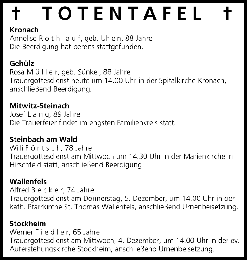 Hier finden Sie alle Traueranzeigen aus der Zeitung, die bisher für Totentafel vom 03.12.2013 erschienen sind. Weitere Traueranzeigen, die in der Zeitung erscheinen, werden hier ebenfalls aufgelistet