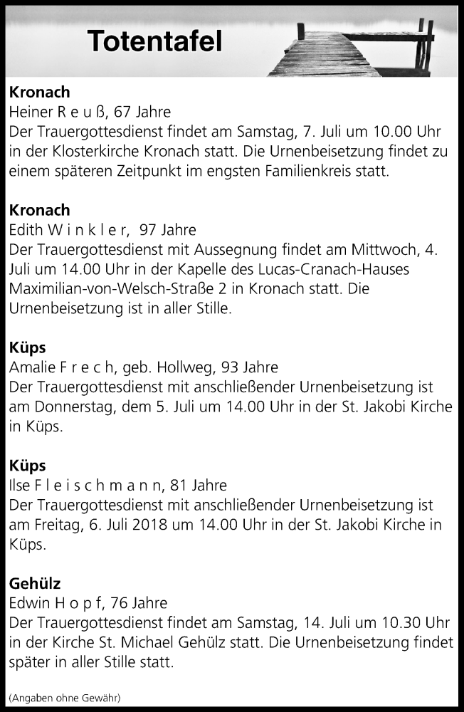 Hier finden Sie alle Traueranzeigen aus der Zeitung, die bisher für Totentafel vom 04.07.2018 erschienen sind. Weitere Traueranzeigen, die in der Zeitung erscheinen, werden hier ebenfalls aufgelistet