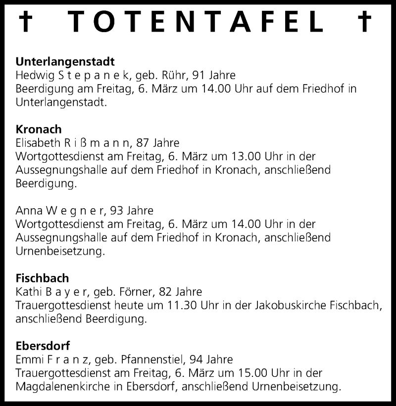 Hier finden Sie alle Traueranzeigen aus der Zeitung, die bisher für Totentafel vom 05.03.2015 erschienen sind. Weitere Traueranzeigen, die in der Zeitung erscheinen, werden hier ebenfalls aufgelistet
