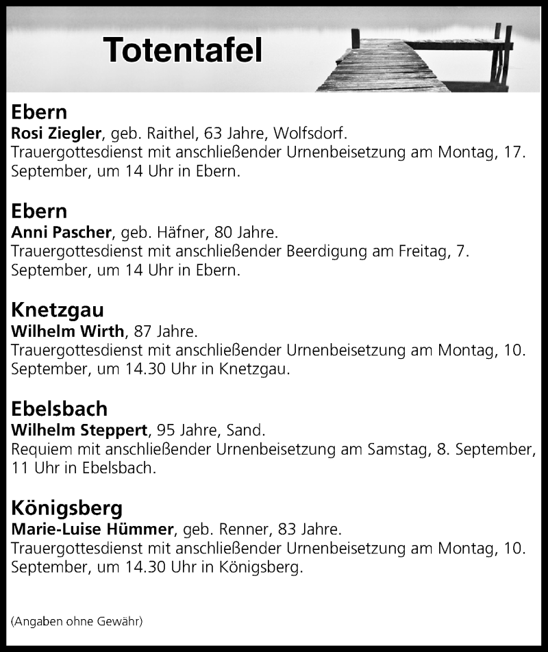 Hier finden Sie alle Traueranzeigen aus der Zeitung, die bisher für Totentafel vom 07.09.2018 erschienen sind. Weitere Traueranzeigen, die in der Zeitung erscheinen, werden hier ebenfalls aufgelistet