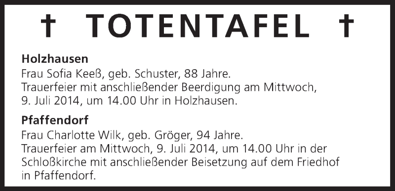 Hier finden Sie alle Traueranzeigen aus der Zeitung, die bisher für Totentafel vom 08.07.2014 erschienen sind. Weitere Traueranzeigen, die in der Zeitung erscheinen, werden hier ebenfalls aufgelistet