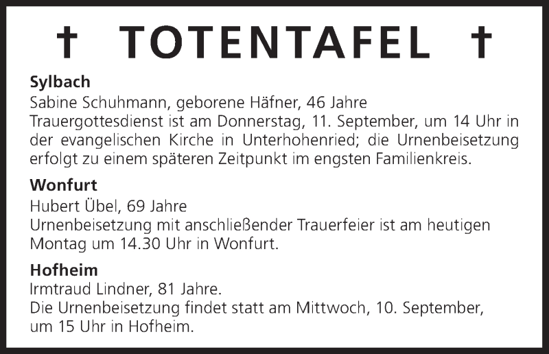 Hier finden Sie alle Traueranzeigen aus der Zeitung, die bisher für Totentafel vom 08.09.2014 erschienen sind. Weitere Traueranzeigen, die in der Zeitung erscheinen, werden hier ebenfalls aufgelistet