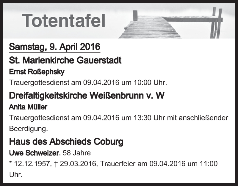 Hier finden Sie alle Traueranzeigen aus der Zeitung, die bisher für Totentafel vom 09.04.2016 erschienen sind. Weitere Traueranzeigen, die in der Zeitung erscheinen, werden hier ebenfalls aufgelistet