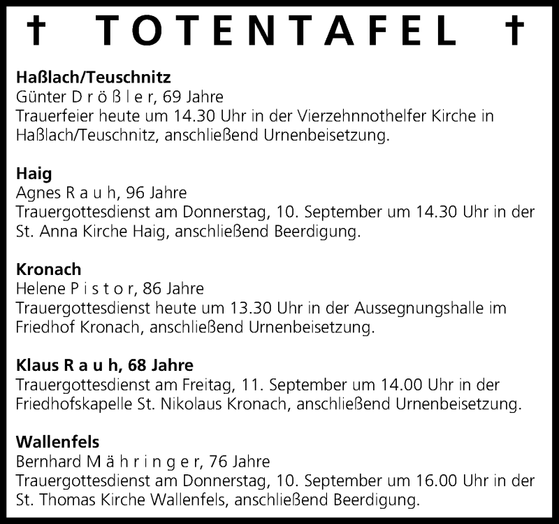 Hier finden Sie alle Traueranzeigen aus der Zeitung, die bisher für Totentafel vom 09.09.2015 erschienen sind. Weitere Traueranzeigen, die in der Zeitung erscheinen, werden hier ebenfalls aufgelistet