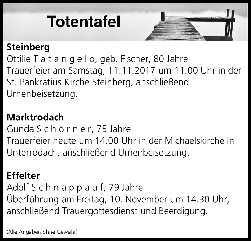 Hier finden Sie alle Traueranzeigen aus der Zeitung, die bisher für Totentafel vom 09.11.2017 erschienen sind. Weitere Traueranzeigen, die in der Zeitung erscheinen, werden hier ebenfalls aufgelistet