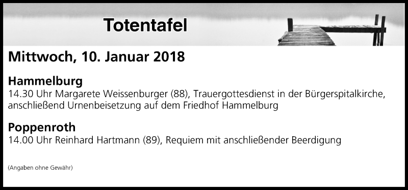 Hier finden Sie alle Traueranzeigen aus der Zeitung, die bisher für Totentafel vom 10.01.2018 erschienen sind. Weitere Traueranzeigen, die in der Zeitung erscheinen, werden hier ebenfalls aufgelistet