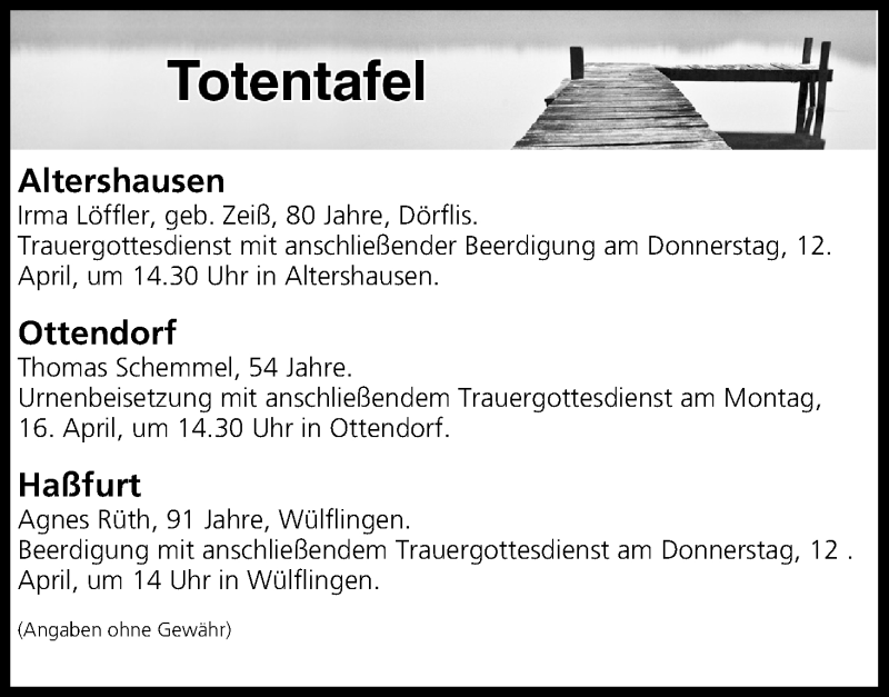 Hier finden Sie alle Traueranzeigen aus der Zeitung, die bisher für Totentafel vom 11.04.2018 erschienen sind. Weitere Traueranzeigen, die in der Zeitung erscheinen, werden hier ebenfalls aufgelistet