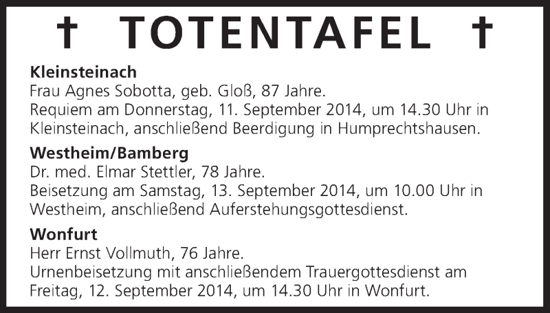 Hier finden Sie alle Traueranzeigen aus der Zeitung, die bisher für Totentafel vom 11.09.2014 erschienen sind. Weitere Traueranzeigen, die in der Zeitung erscheinen, werden hier ebenfalls aufgelistet